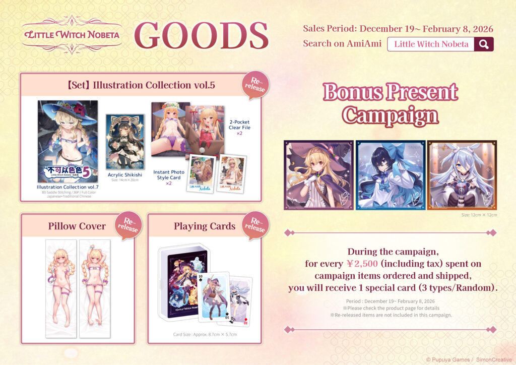 During the campaign, for every 2,500 yen (including tax) spent on “Little Witch Nobeta” bonus present campaign items ordered and shipped, you will receive 1 special card (3 types in total).